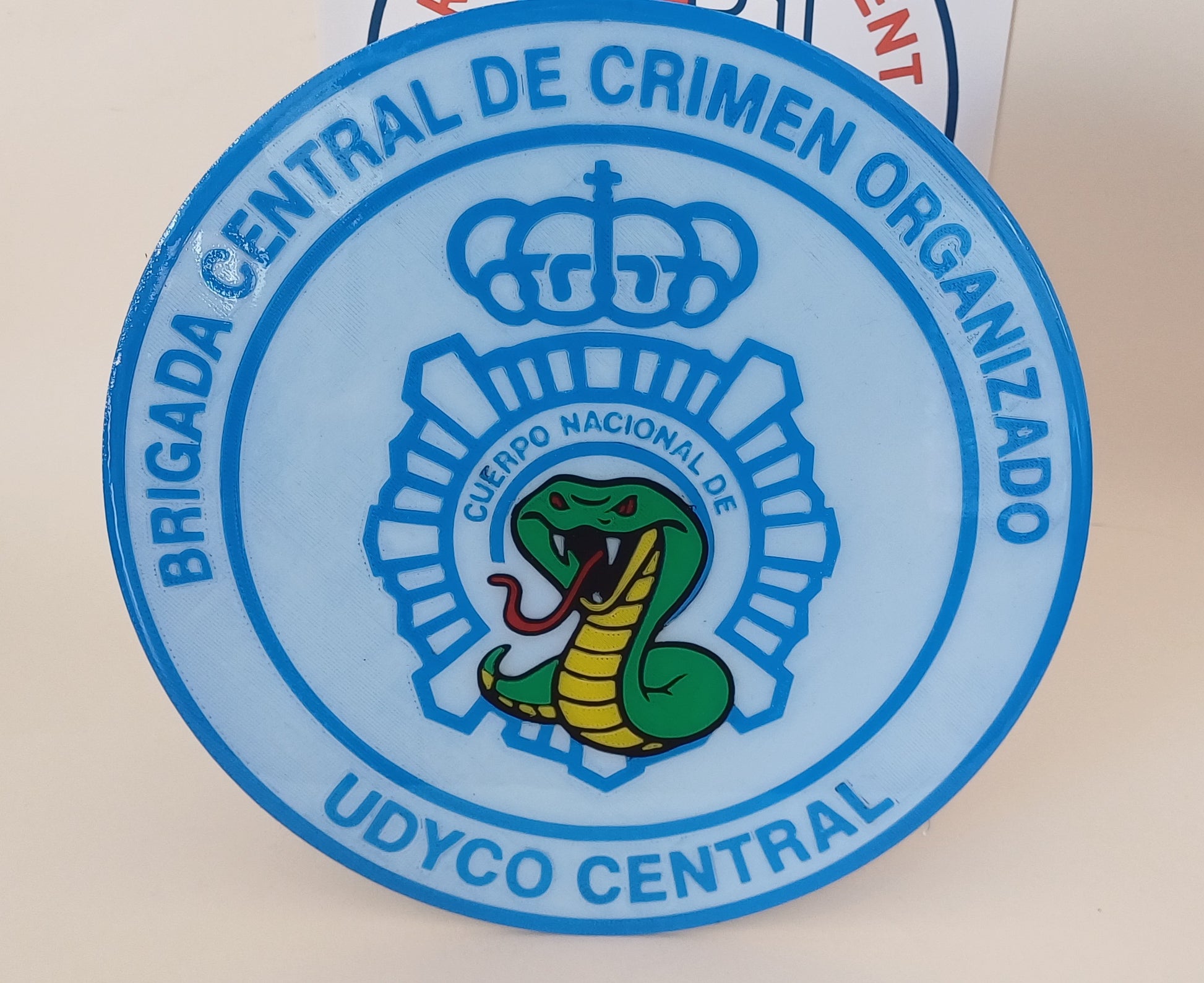 Placa decorativa de las Unidades de Droga y Crimen Organizado (UDYCO), que son unidades especializadas del Cuerpo Nacional de Policía pertenecientes a la Comisaría General de Policía Judicial dedicadas a la lucha contra el narcotráfico y el crimen organizado. Mide 21,5 cm y es plana, sin relieve.