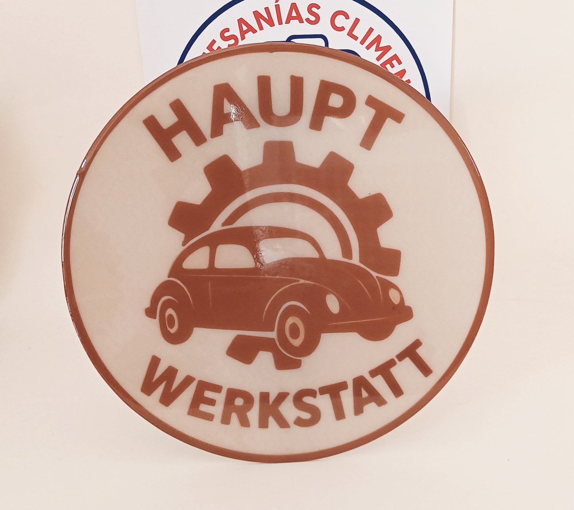 Placa decorativa estilo vintage del vehículo del pueblo, con la rueda dentada símbolo del frente del trabajo alemán "arbeitsfront". Con la creación de este vehículo se pretendió elevar la movilidad del trabajador alemán para su disfrute, especialmente de las clases medias de la nación. Mide 21cm.